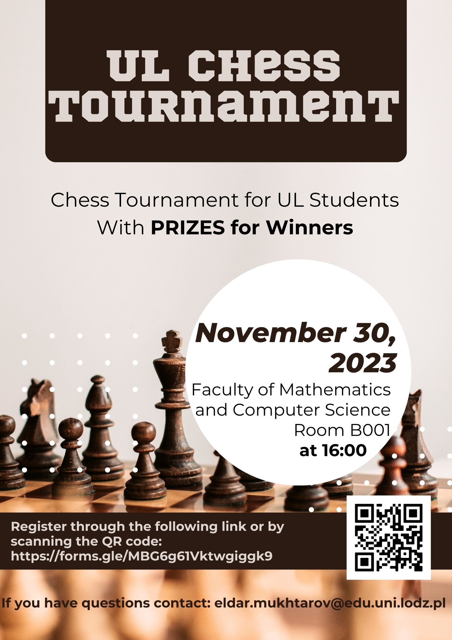 You are cordially invited to chess tournament which will be held at the Faculty of Mathematics and Computer Science, University of Lodz, on 30 November at 16:00 in room B001. The tournament is open to all students of the University of Lodz.